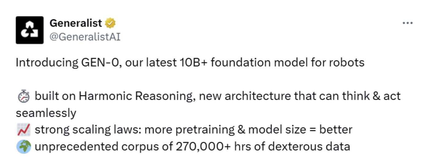 近日,AI机器人公司Generalist发布了GEN-0,一个参数量超过10B的具身基础模型。作为首个验证了具身智能规模定律(Embodied Scaling Law)的机器人通用基础模型,GEN-0的发布也被誉为机器人领域的“ChatGPT时刻”。