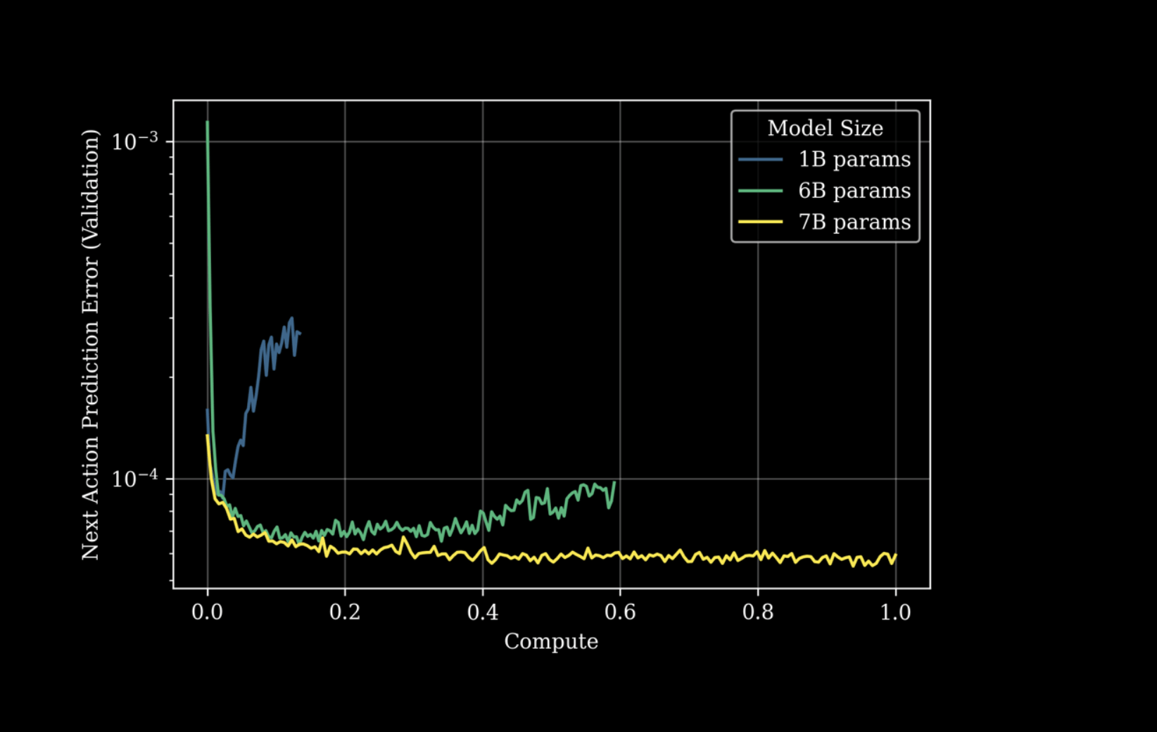 除此之外,GEN-0的研究团队发现,机器人智能存在清晰的“相变阈值”。当模型规模不足时,即使增加数据,性能也会停滞不前,但一旦超过阈值,性能则开始呈指数级提升。下图直观地展示了这一现象:1B参数(蓝线)模型在训练初期便出现固化(误差不再下降),而6B(绿)和7B(黄)模型随着算力和数据的增加持续改进。